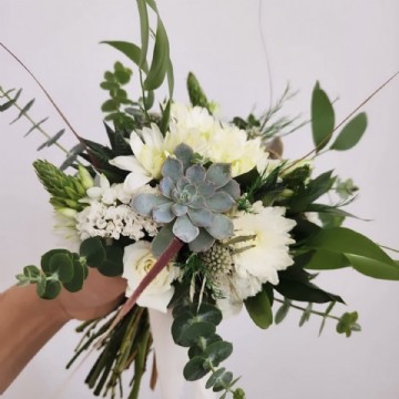 Sukulentlerin eÅŸsiz dokusu ve krizantemlerin zarif görünümüyle oluÅŸturulmuÅŸ bu gelin buketi, doÄŸal bir şıklık ve zarafet sunar. YemyeÅŸil sukulentlerin modern dokunuÅŸu, krizantemlerin klasik güzelliÄŸiyle birleÅŸerek unutulmaz bir görünüm oluÅŸturur.